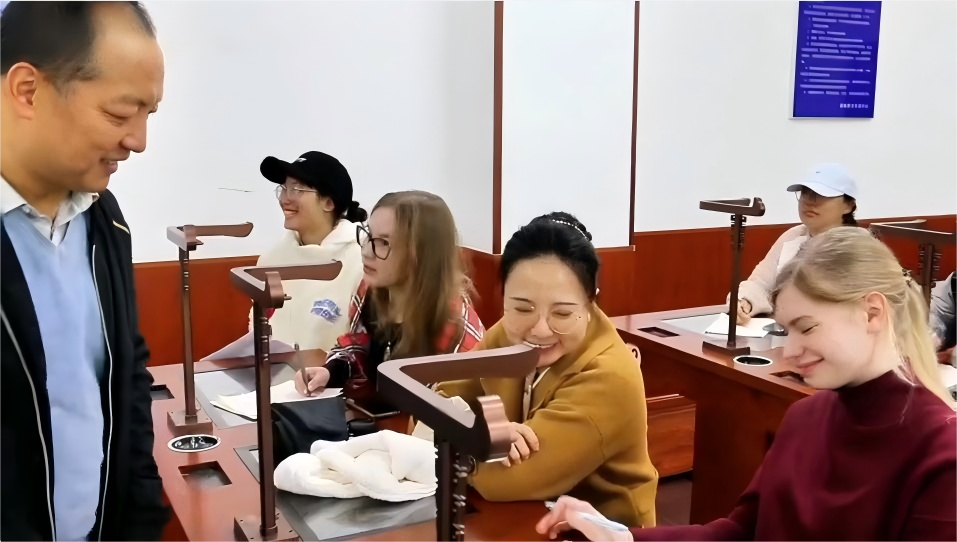 护理学院的中医讲堂上,在夏西超院长和明虎斌的专业指导下,两位俄罗斯学生专注地了解中医理论,亲身体验针灸、推拿的独特魅力,感受传统医学的博大精深。
